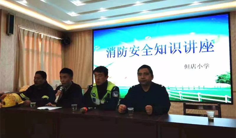 2018年11月27日,团风县但店派出所与交警二中队民警一同前往但店小学开展安全知识讲座,上午9时许,但店小学和但店幼儿园的小朋友们在学校操场集结完毕。首先由派出所专职消防队员陈劲松现场示范了灭火器材的使用方法,并现场与同学们进行互动,手把手教孩子们使用灭火器,活动现场气氛活跃,小朋友们纷纷举手主动参与互动。随后,消防队员现场演示了消防车如何进行喷水灭火,震撼的现场给同学们留下了深刻印象。