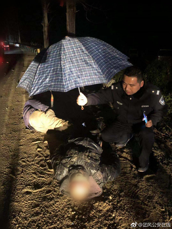 通知小车司机等待调查后,立即疏散围观人群,设置警戒预防二次事故,并对伤者进行救援。当晚下着小雨,温度低至零下,见到2名伤者躺在湿冷的路面,民警撑起雨伞为头部受伤的伤者遮雨,并找来雨衣盖在另一名伤者身上防止被雨淋湿。120急救车到达后,民警协助医护人员将2名伤者抬上急救车,送往医院接受救治。