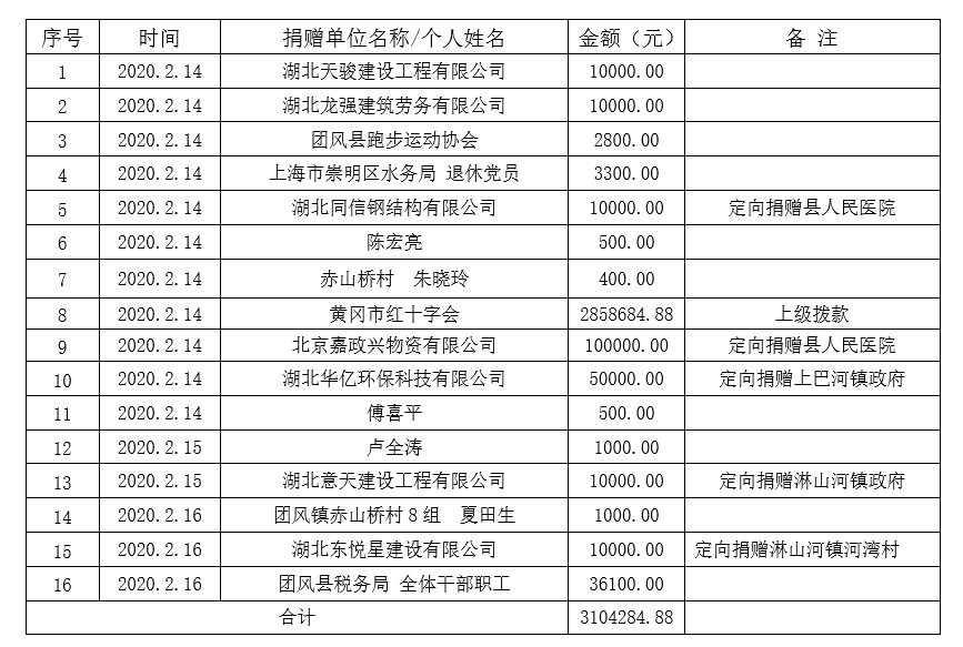 自新型冠状病毒感染的肺炎疫情发生以来,社会各界对我县疫情防控工作给予了大力支持和援助,纷纷慷慨解囊,捐款捐物,体现了社会大爱和守望相助的精神。2020年2月13日下午5时--16日下午5时,团风县红十字会三日共计接收社会各界及爱心人士捐款245600.00元、上级拨款2858684.88元,共计3104284.88元;接收捐赠物资7批次,捐赠款、物全部交由县疫情防控指挥部统一调配使用。现将第十三批捐赠情况公示如下: