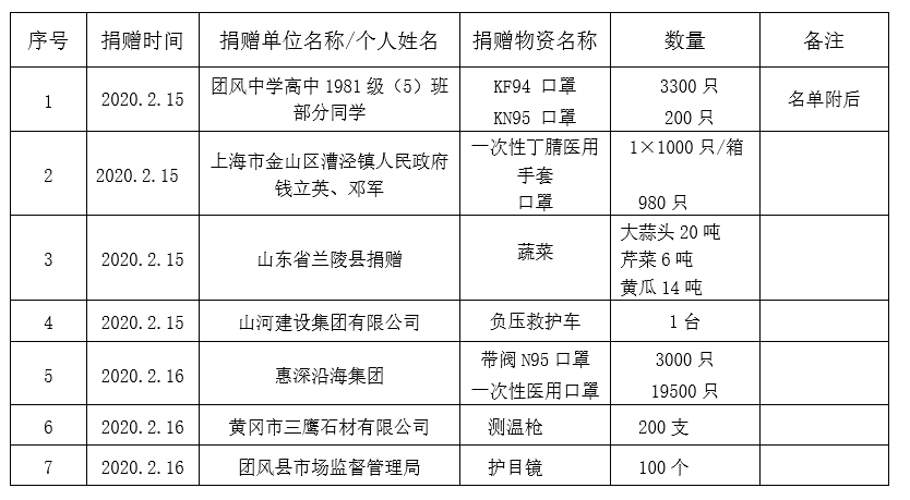 注:现捐赠款、物已交由团风县新型冠状病毒感染的肺炎指挥部统一调配使用。