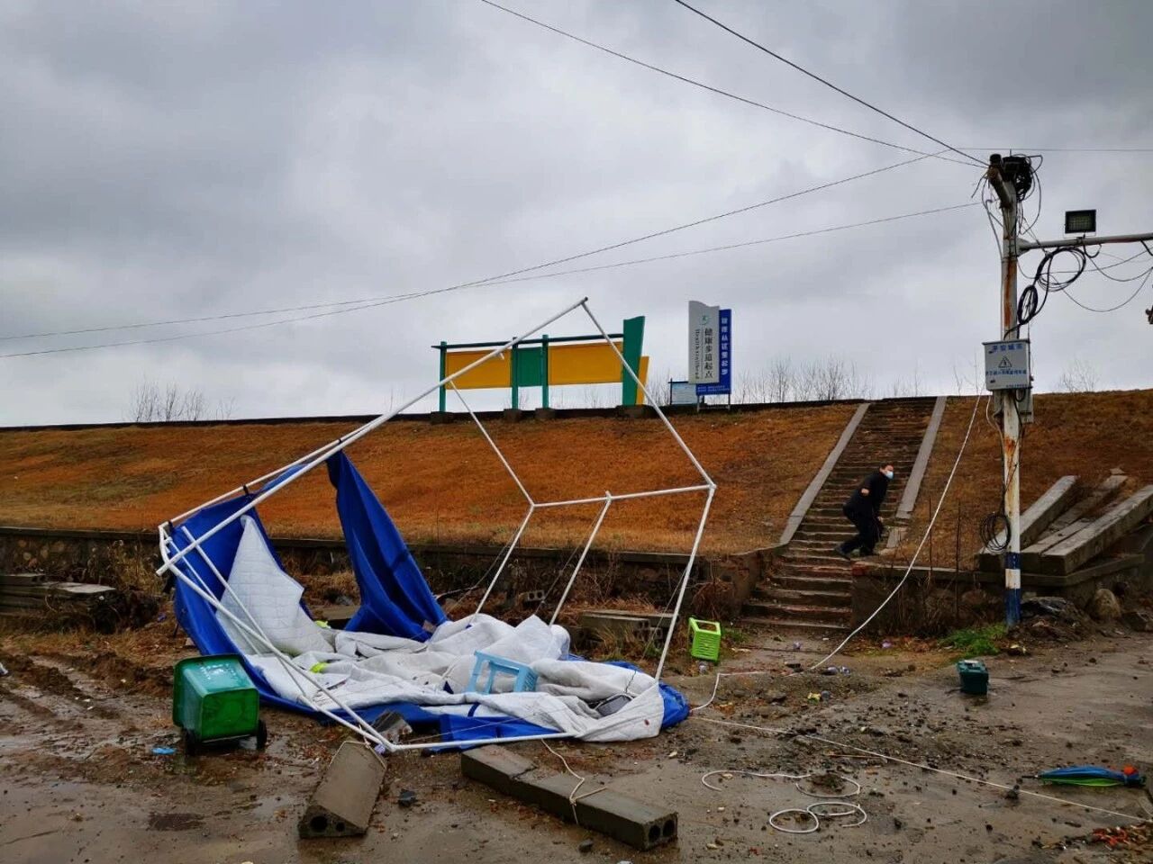2月14日团风气温骤降十几度,晚上更是狂风骤雨,各执勤卡点搭建的用于夜间避寒和临时休息的帐篷无一例外,全被大吹倒甚至掀翻。那一夜,大家在风雨中饥寒交迫,有临近退休的老同志,有从没上过夜