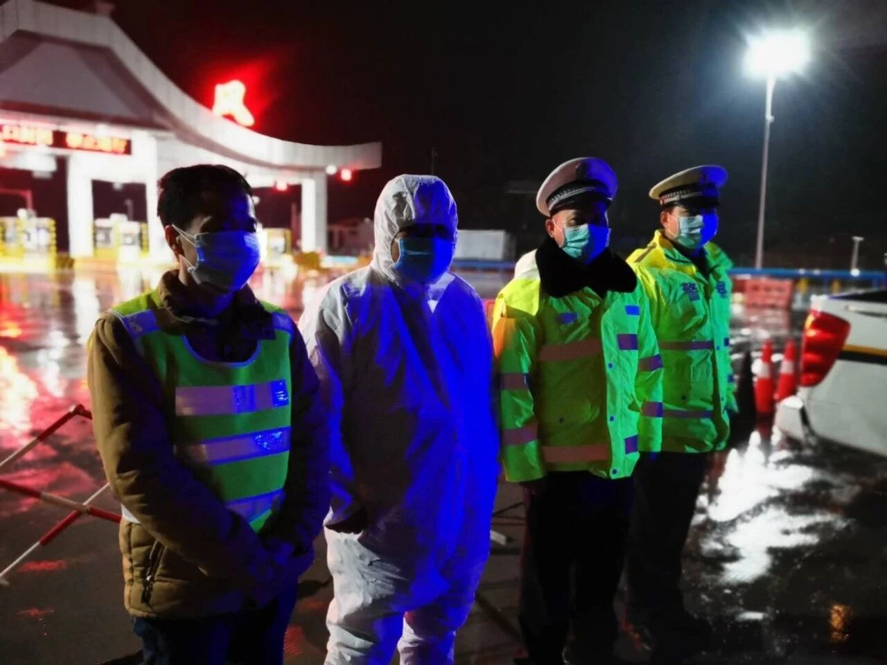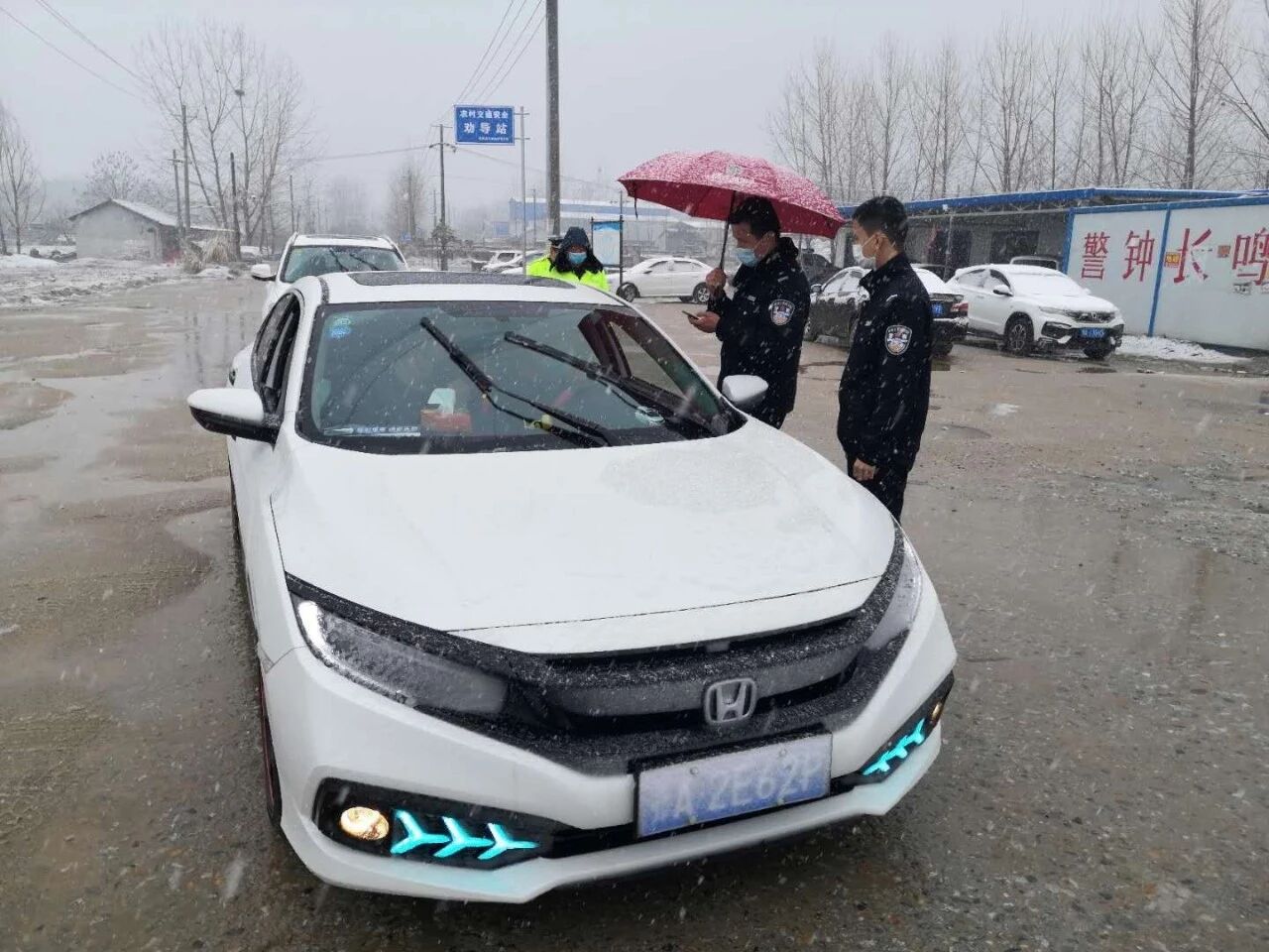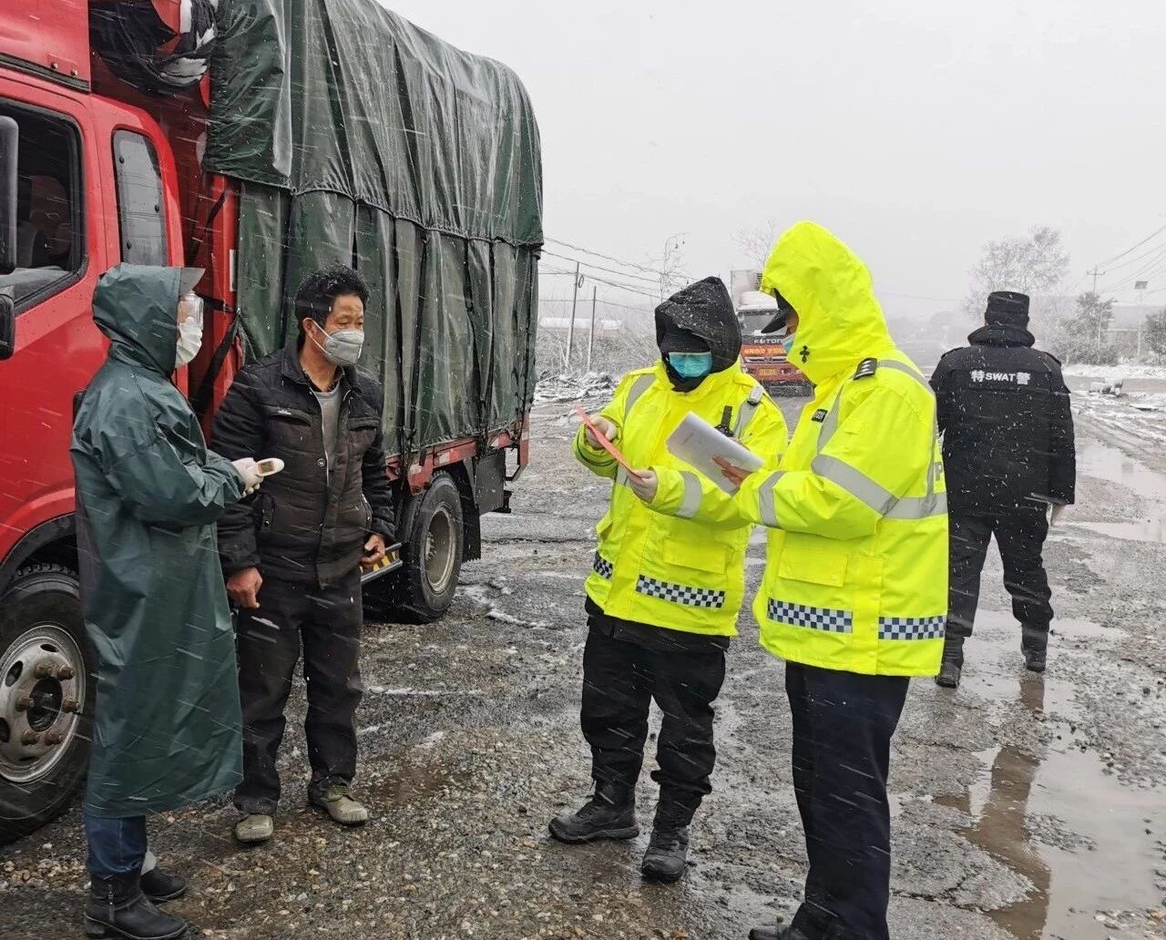 2月15日上午,团风开始下起了小雪,到了中午雪越下越大,在大雪纷飞中所有卡口执勤的民辅警顶着严寒和风雪,密切关注着道路状况,认真检查每一辆车辆。每当有机动车靠近检查点,民警立即挥手示意车辆减速接受检查,“您从哪里来呀?准备去哪里呀?车上有几个人?有通行证吗?”“为了防控疫情,我们在此设卡检查,请配合我们的工作”“雪天路滑,请一定小心慢行,注意交通安全”……