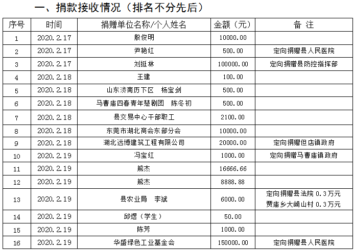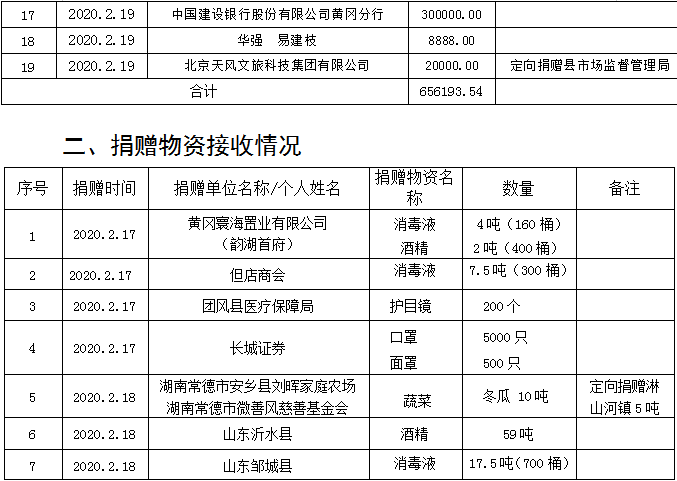 注:现捐赠款、物已交由团风县新型冠状病毒感染的肺炎防控指挥部统一调配使用。