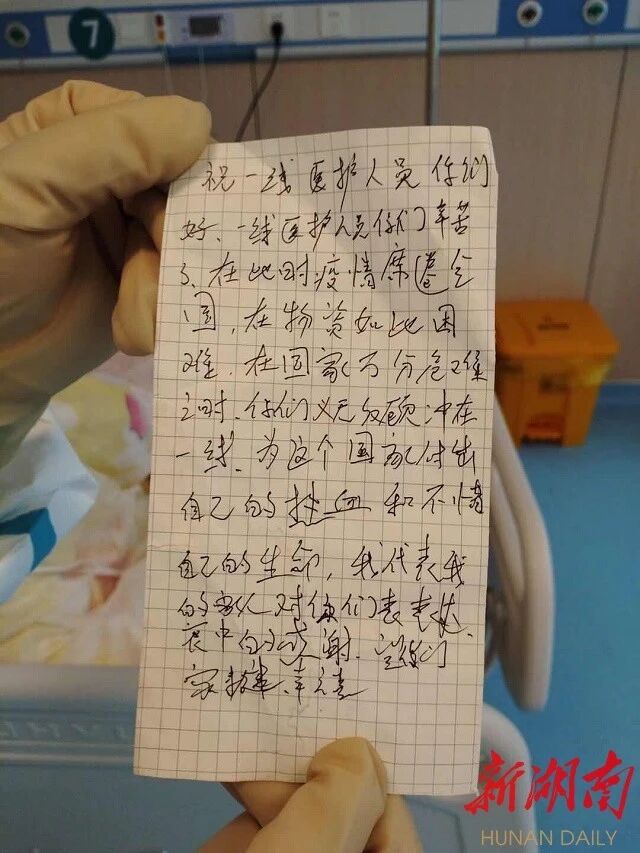 “你们义无反顾冲在一线,为这个国家付出自己的热血,不惜自己的生命,我代表我和家人对你们表达衷心的感谢……”一名患者在黄冈市大别山区域医疗中心湖南医疗队重症医学科的病床下留下感谢信。