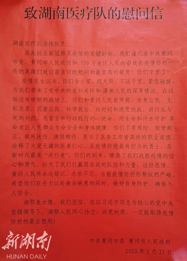 此前的2月19日,黄冈市委、市政府还专程向湖南省委、省政府发出感谢信,感谢“湖南省委、省政府高度重视,第一时间派出医护力量,提供医用物资和生活物资支援,有效缓解了我市疫情防控人才和物资紧缺问题,极大地鼓舞了我市人民战胜疫情的信心和决心。”并表示“潇湘大爱,永志不忘。”