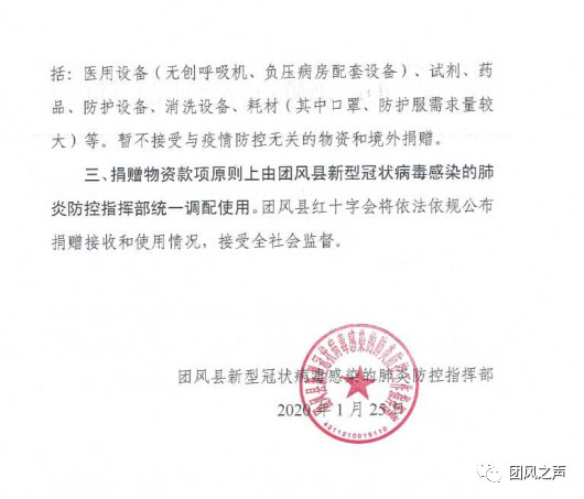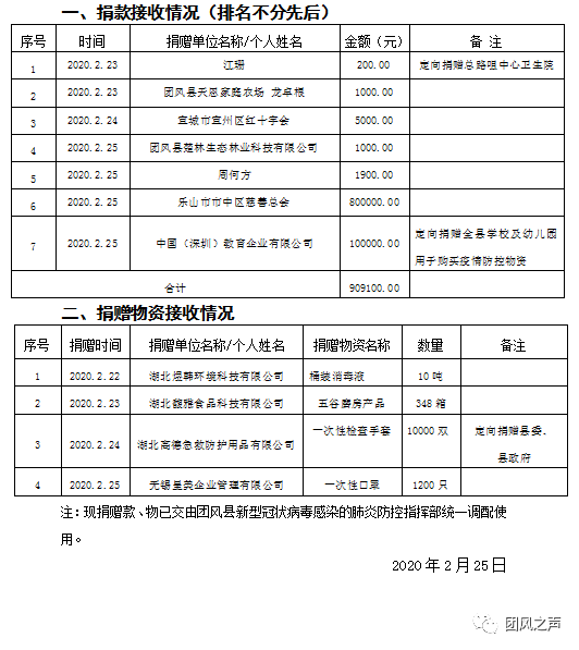 团风县红十字会关于接收疫情防控捐赠情况的公示(十六) 自新型冠状病毒感染的肺炎疫情发生以来,社会各界对我县疫情防控工作给予了大力支持和援助,纷纷慷慨解囊,捐款捐物,体现了社会大爱和守望相助的精神。2020年2月22日下午5时--25日下午5时,团风县红十字会三日共计接收社会各界及爱心人士捐款909100.00元;接收捐赠物资4批次,捐赠款、物全部交由县疫情防控指挥部统一调配使用。现将第十六批捐赠情况公示如下: