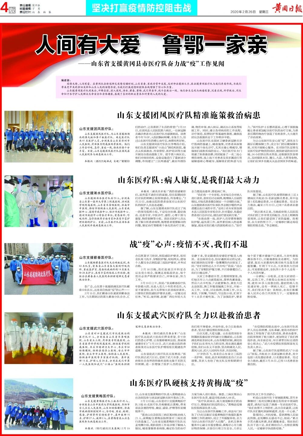 山东援黄冈医疗队到来后,冲锋在前,深入团风、浠水、蕲春、黄梅、武穴等县市,战斗在救治一线。他们舍生忘死与病毒较量,沉着应战,科学救治,用生命和汗水守护人民群众生命安全和身体健康,展现了良好的职业素养和对黄冈人民的大爱。