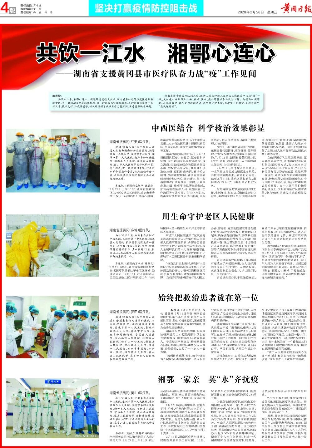 共饮一江水,湘鄂心连心。新冠肺炎疫情发生后,湖南省第一时间组建医疗队驰援黄冈,第一时间动员全省捐款捐物,第一时间成立前方指挥部,及时向我市提供了医疗人才、技术支撑、防疫物资等,极大地缓解了我市医疗力量薄弱、医疗资源缺乏难题。