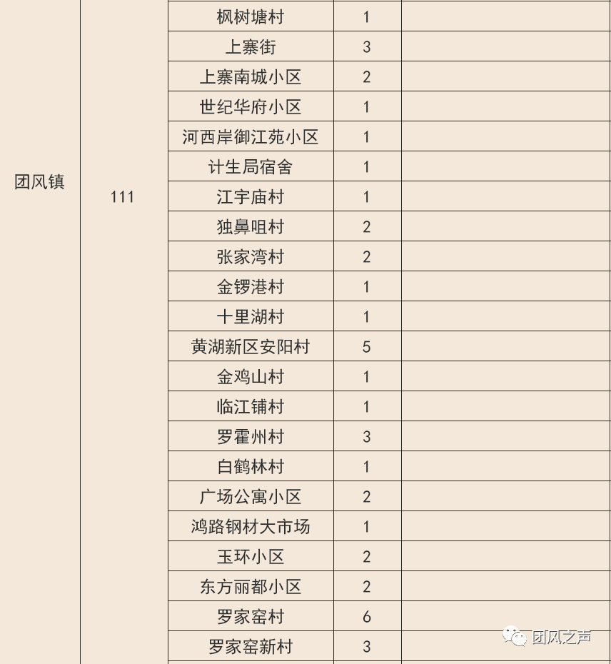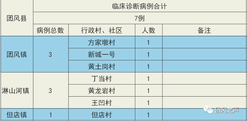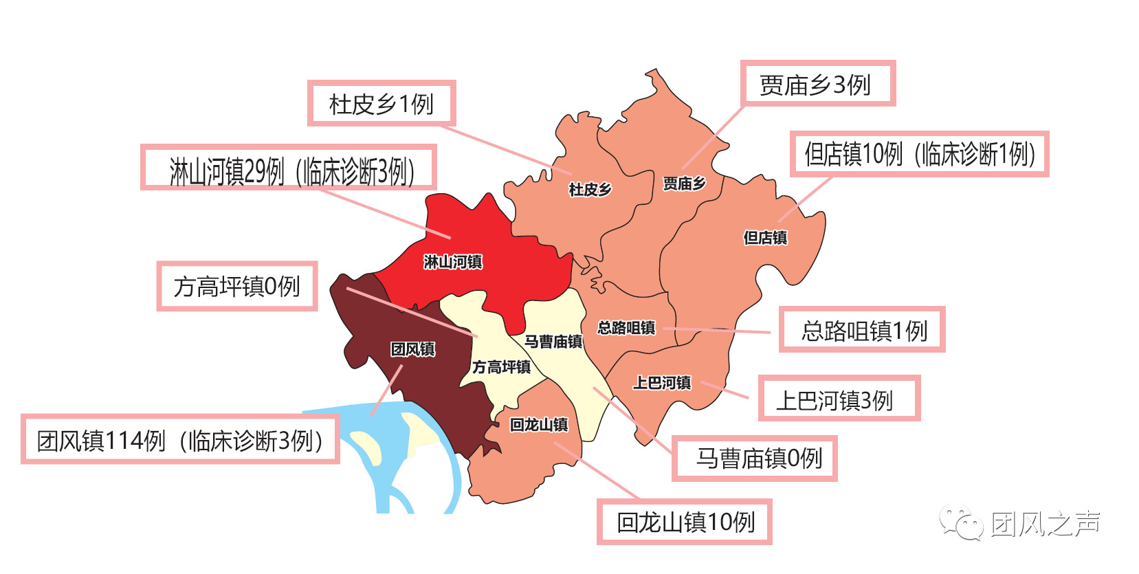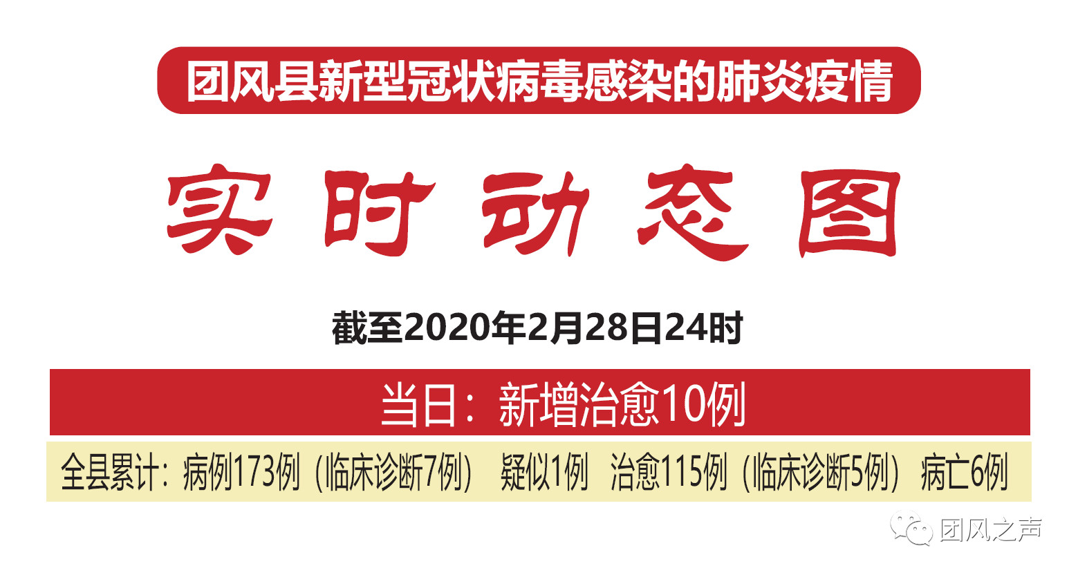 截至2月28日24时,团风全县累计病例173例(临床诊断7例),已全部收治入院治疗。其中,团风镇114例(临床诊断3例)、淋山河镇29例(临床诊断3例)、方高坪镇0例、但店镇10例(临床诊断1例)、总路咀镇1例、马曹庙镇0例、杜皮乡1例、贾庙乡3例、回龙山镇10例、上巴河镇3例。疑似病例1例,治愈115例(临床诊断5例),病亡6例。