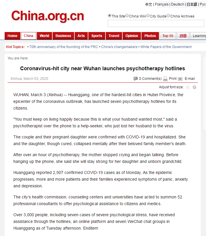 (新华社武汉3月3日电)黄冈,湖北省内疫情最为严重的城市之一,目前,已为其市民开通了7部心理援助热线。