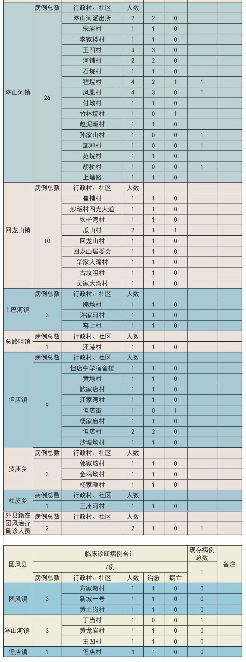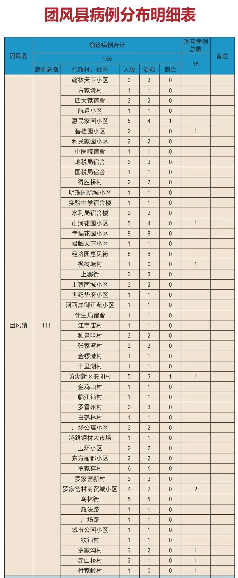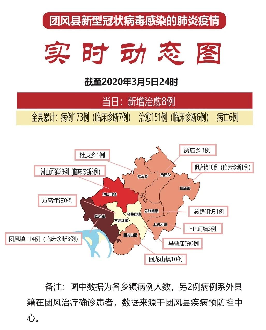 截至3月5日24时,团风全县累计病例173例(临床诊断7例),已全部收治入院治疗。其中,团风镇114例(临床诊断3例)、淋山河镇29例(临床诊断3例)、方高坪镇0例、但店镇10例(临床诊断1例)、总路咀镇1例、马曹庙镇0例、杜皮乡1例、贾庙乡3例、回龙山镇10例、上巴河镇3例。治愈151例(临床诊断6例),病亡6例。