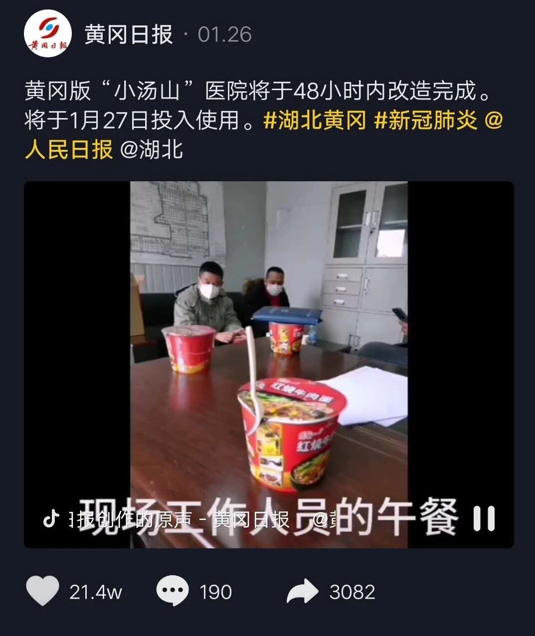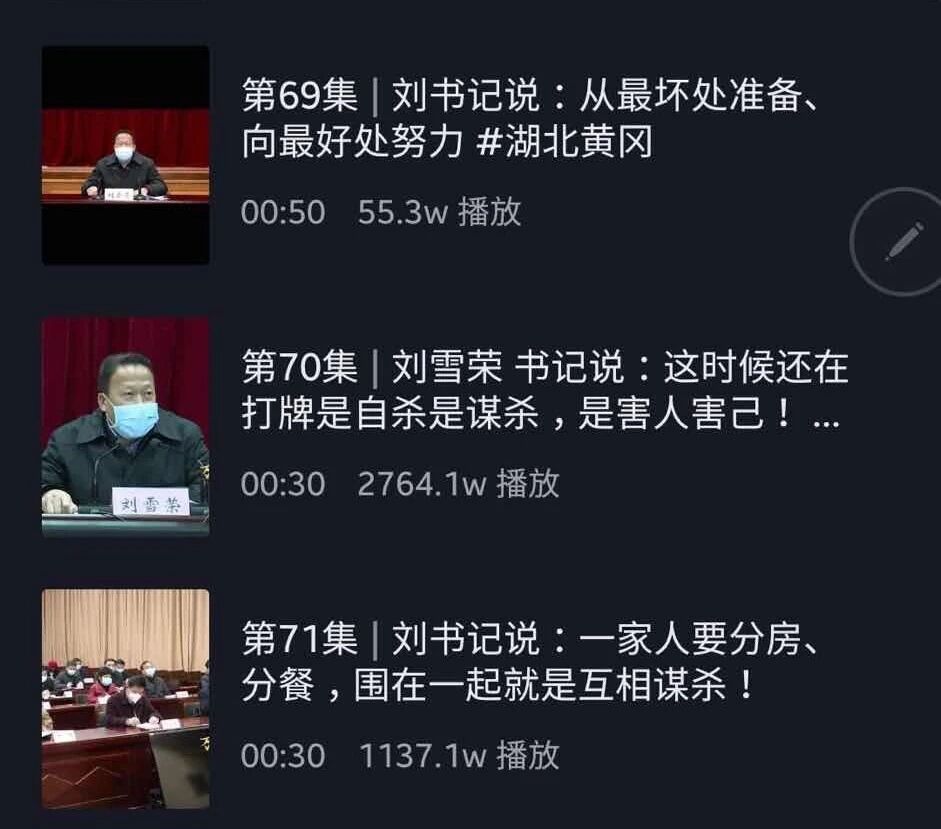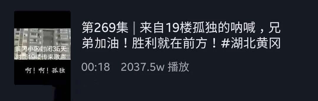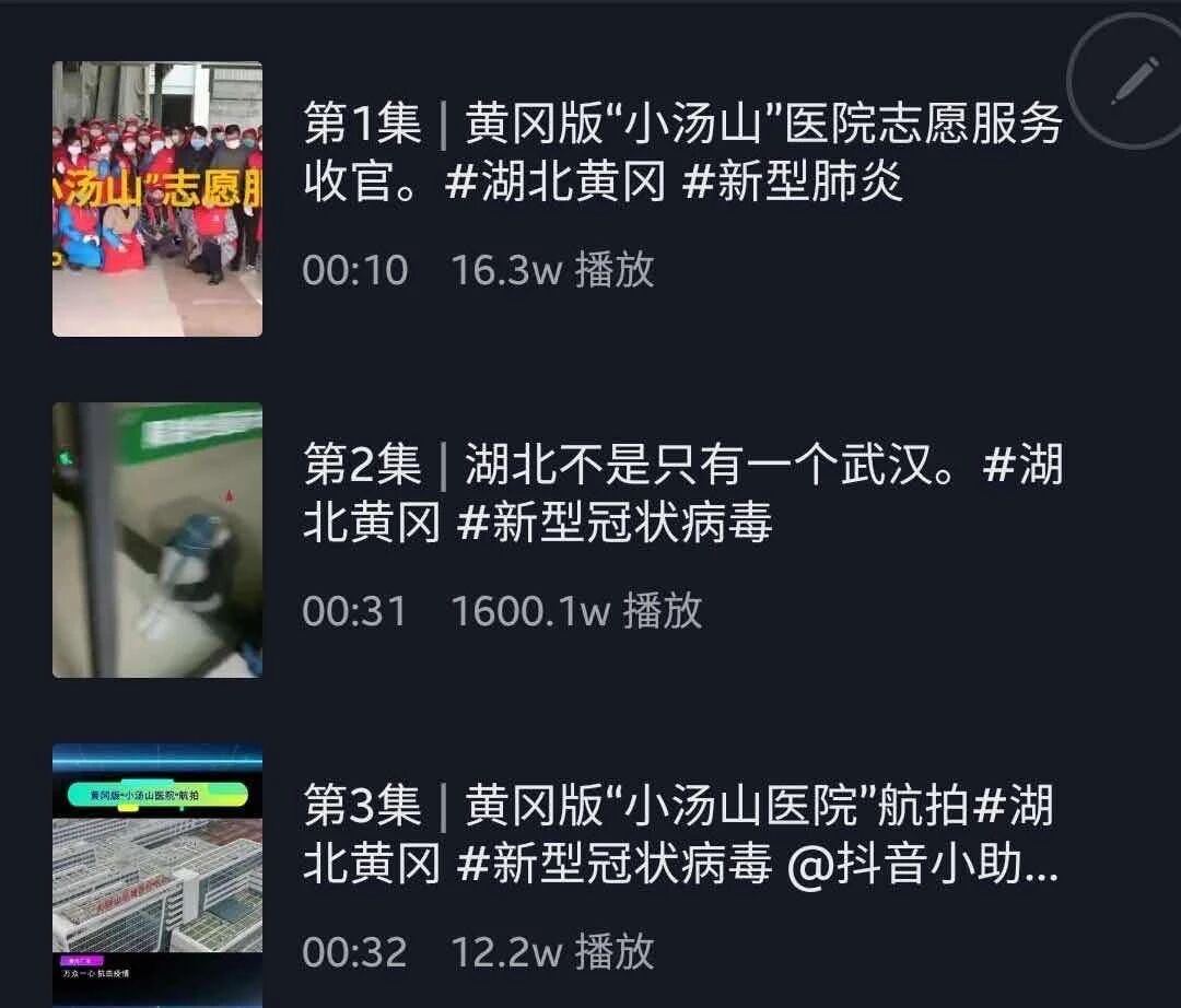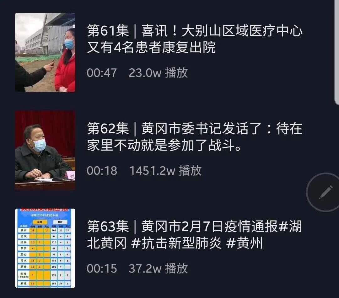 3月6日,抖音作品《兄弟加油,胜利就在前方》呼吁全市上下再忍耐继续坚守,引发网友强烈共鸣,半天内阅读量超过2000万人次,这是疫情以来全市第10个过千万的抖音小视频,包括黄冈日报、直播黄冈在内的市属抖音平台共同贡献了38个阅读量过百万的作品。