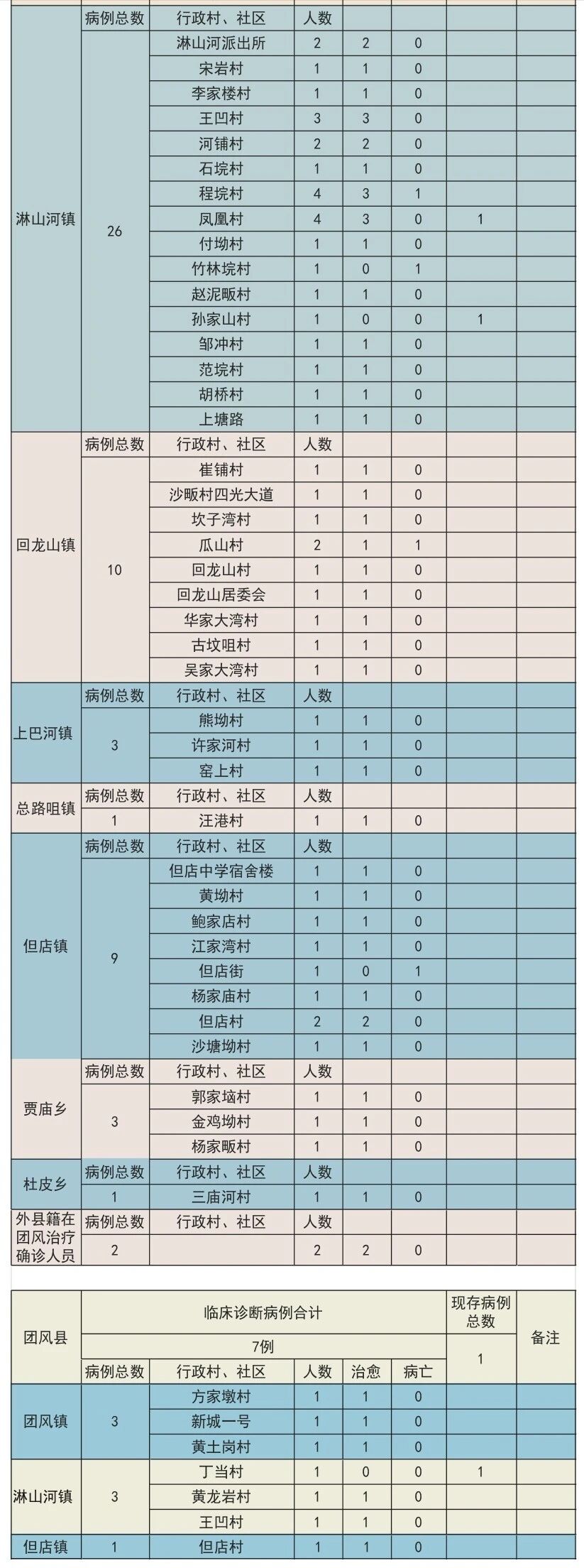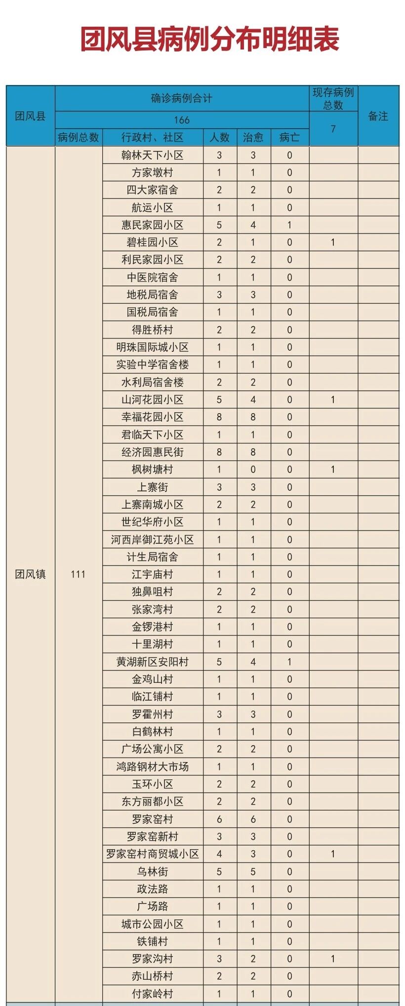 截至3月8日24时,团风全县累计病例173例(临床诊断7例),已全部收治入院治疗。其中,团风镇114例(临床诊断3例)、淋山河镇29例(临床诊断3例)、方高坪镇0例、但店镇10例(临床诊断1例)、总路咀镇1例、马曹庙镇0例、杜皮乡1例、贾庙乡3例、回龙山镇10例、上巴河镇3例。治愈159例(临床诊断6例),病亡6例。