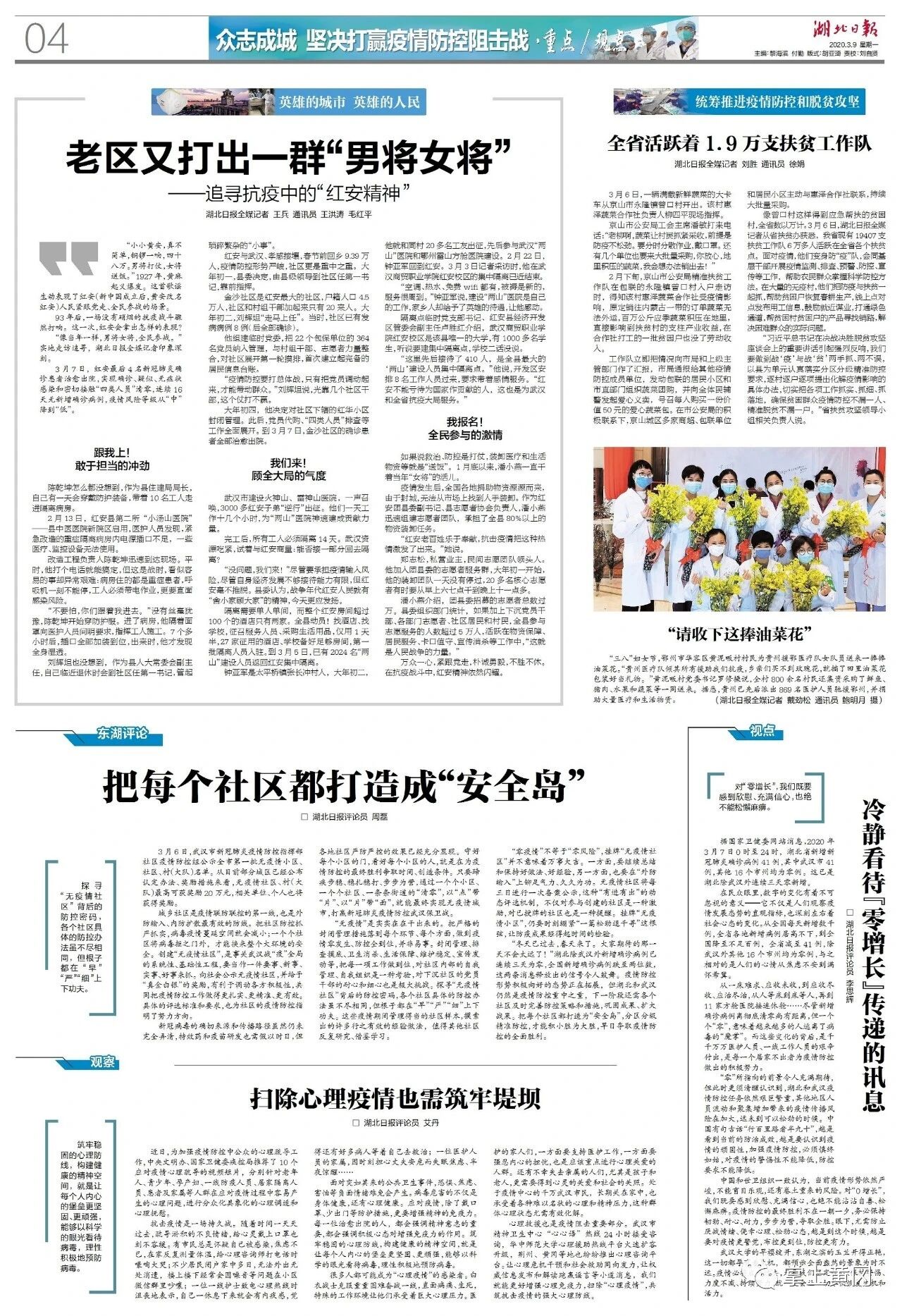 大年初四,他决定对社区下辖的红华小区封闭管理。此后,党员代购、“四类人员”排查等工作全面展开。到3月7日,金沙社区的确诊患者全部治愈出院。