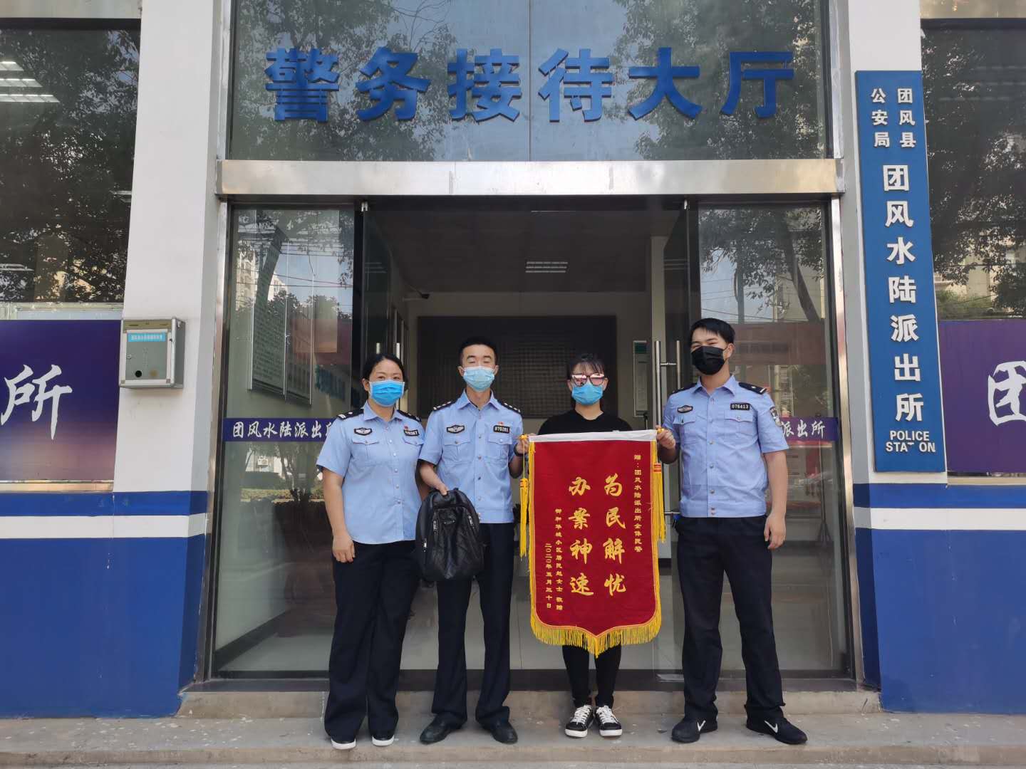 2020年5月28日14时许,团风水陆派出所接到群众赵女士报警称:自己的背包在骑电动车上班途中丢失,包内有现金和证件,请求民警帮忙寻找。接到报警,民警通过技术手段立即展开“寻包行动”,通过大量的排查工作确定赵女士的背包遗失地点为团风县江北加油站进口处,同时找到了捡到背包的路人相关情况。通过调查走访和朋友圈寻人,民警成功为赵女士找回遗失的背包。看到失而复得的背包,赵女士十分高兴,6月1日上午,特地为民警送来一面印有“为民解忧、办案神速”的锦旗,以表感激之情。