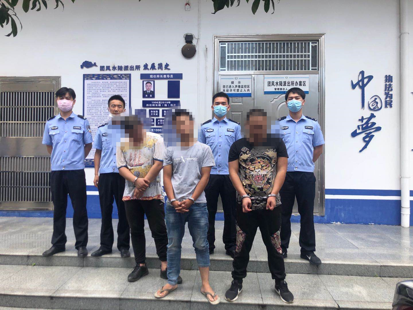 接到报警后,团风水陆派出所副所长邵志催迅速带队赶赴现场,发现四楼入户门紧锁,民警敲门但是屋内的人拒不开门。无奈之下,民警破窗而入,发现3名可疑男子从后门开溜准备翻到隔壁阳台逃跑,副所长邵志催迅速反应,连忙带人将3名可疑男子当场制服。随后,民警在屋内找到了吸毒工具,对3人进行尿液检测均呈现阳性。