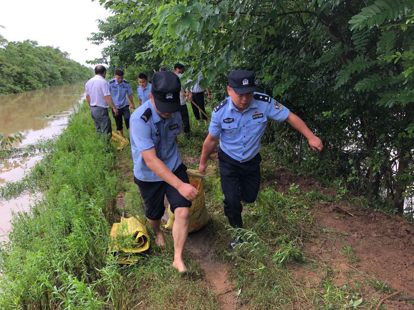部分河域水位迅速上涨,险情告急,团风公安应急抢险救援突击队联合武警、应急管理、交通局等部门开展抢险救援工作,齐心协力装填砂石料、转运砂石包、填埋加固险段,及时排除险情,确保了人民群众的生命和财产安全。