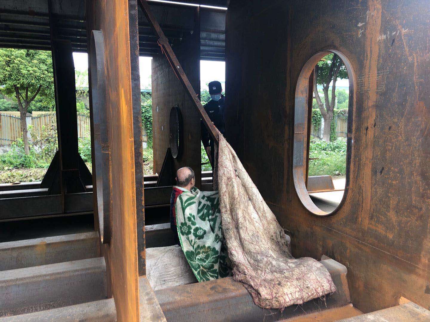 民警赶赴现场,发现一名年迈的爹爹坐在铁硼内,身上仅披着一条薄毛毯,蜷缩在角落里,全身冻得瑟瑟发抖。民警见状立马上前询问情况,并缓缓扶起老人,小心翼翼将他扶上车,并打开空调为老人取暖。
