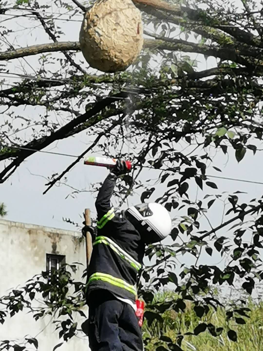 2020年10月10日上午9时许,派出所民辅警迅速联系报警人了解情况并开展马蜂窝摘除行动。为避免摘除过程中马蜂伤人,民辅警先疏散围观人群,随后迅速穿好防蜂服、拿上编织袋、攀梯上树,用事先准备好的杀虫剂对马蜂窝周围的马蜂进行喷杀,再用编织袋将整个马蜂窝牢牢套住并收紧袋口,将马蜂窝连根拔起。