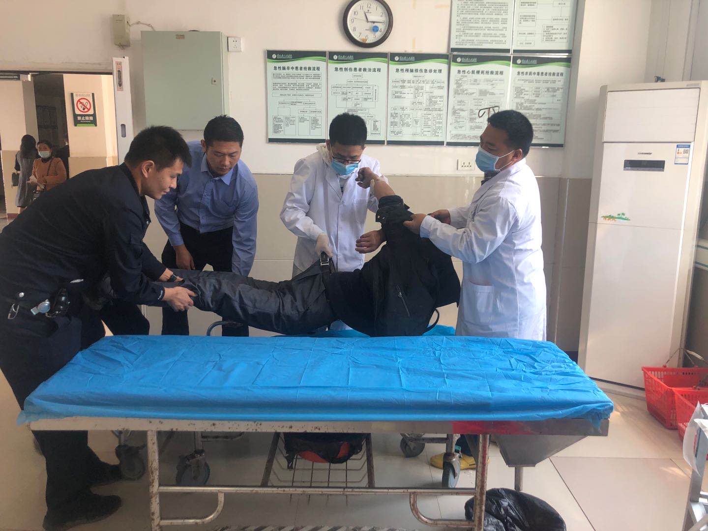 得知医院的120急救车均已外出救治后,民警当机立断,在确保安全的前提下,以最快的速度用警车送男子到医院急救中心救治。